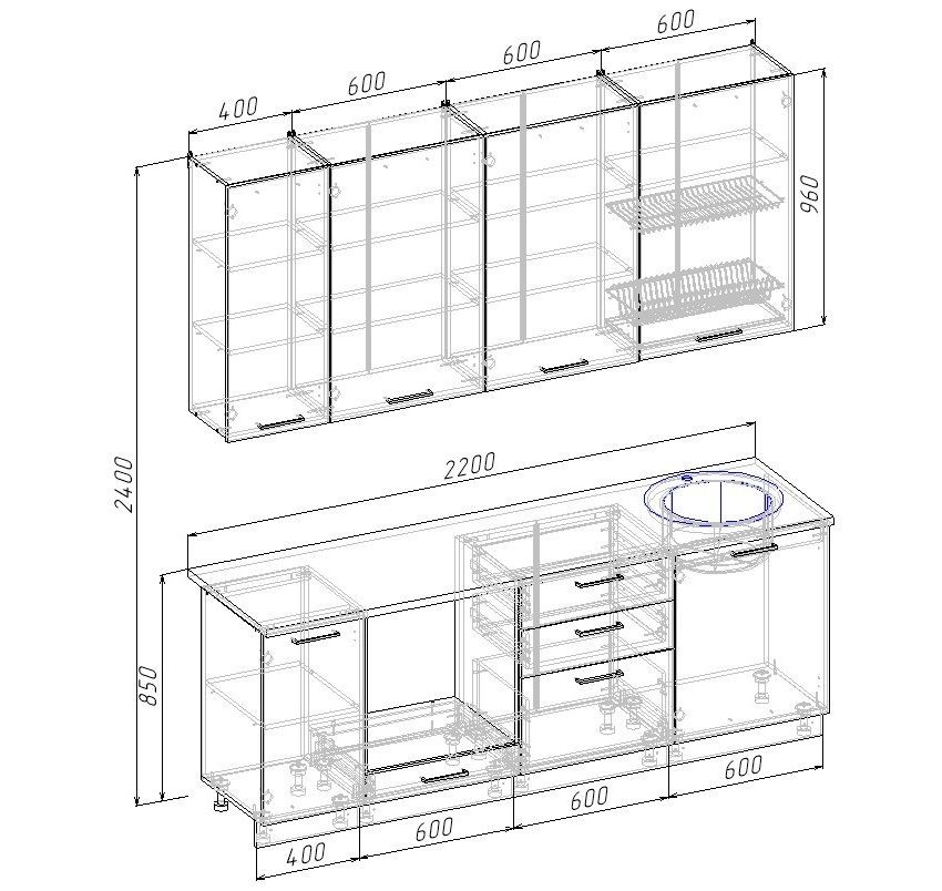 Фасады верхних модулей со свесом 12 мм дают возможность использовать без установки ручек.